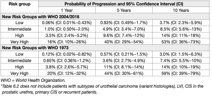Table 1: Clinical composition of the new EAU NMIBC prognostic factor risk groups based on the WHO 2004/2016 or the WHO 1973 grading classification systems