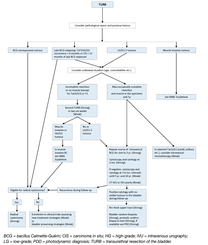 Although TURB by itself can eradicate a TaT1 tumour completely, these tumours commonly recur and can progress to MIBC. The high variability in the 3-month recurrence rate indicates that the TURB was incomplete or provokes recurrences in a high percentage of patients [28]. It is therefore necessary to consider adjuvant therapy in all patients.