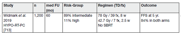 111. Aluwini, S., et al. Hypofractionated versus conventionally fractionated radiotherapy for patients with prostate cancer (HYPRO): late toxicity results from a randomised, non-inferiority, phase 3 trial. Lancet Oncol, 2016. 17: 464. https://pubmed.ncbi.nlm.nih.gov/26968359/