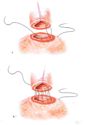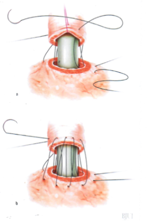 Following prostate removal, the bladder neck is anastomosed to the membranous urethra. The objective is to create a precisely aligned, watertight, tension-free, and stricture-free anastomosis that preserves the integrity of the intrinsic sphincter mechanism. Several methods have been described, based on the direct or indirect approach, the type of suture (i.e. barbed vs. non-barbed/monofilament), and variation in suturing technique (e.g., continuous vs. interrupted, or single-needle vs. double-needle running suture). The direct vesico-urethral anastomosis, which involves the construction of a primary end-to-end inter-mucosal anastomosis of the bladder neck to the membranous urethra by using 6 interrupted sutures placed circumferentially, has become the standard method of reconstruction for open RP [77].
