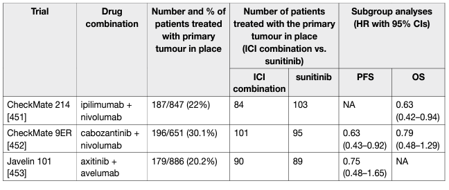 Tumour resection is potentially curative only if all tumour deposits are excised. This includes patients with the primary tumour in place and single- or oligometastatic resectable disease. For most patients with metastatic disease, cytoreductive nephrectomy (CN) is palliative and systemic treatments are necessary. In a combined analysis of two RCTs comparing CN+ IFN-based immunotherapy vs. IFN-based immunotherapy only, increased long-term survival was found in patients treated with CN [1]. However, IFN-based immunotherapy is no longer relevant in contemporary clinical practice. In order to investigate the role and sequence of CN in the era of targeted therapy, a structured literature assessment was performed to identify relevant RCTs and systematic reviews published between July 1st – June 30th 2019. Two RCTs [2,3] and a narrative systematic review were identified [4]. The narrative systematic review included both RCTs and ten non-randomised studies. CARMENA, a phase III non-inferiority RCT investigating immediate CN followed by sunitinib vs. sunitinib alone, showed that sunitinib alone was not inferior to CN followed by sunitinib with regard to OS [5]. The trial included 450 patients with metastatic ccRCC of intermediate- and MSKCC poor-risk of whom 226 were randomised to immediate CN followed by sunitinib and 224 to sunitinib alone. Patients in both arms had a median of two metastatic sites. Patients in both arms had a tumour burden of a median/mean of 140 mL of measurable disease by Response Evaluation Criteria In Solid Tumours (RECIST) 1.1, of which 80 mL accounted for the primary tumour. The study did not reach the full accrual of 576 patients and the Independent Data Monitoring Commission (IDMC) advised the trial steering committee to close the study. In an ITT analysis after a median follow-up of 50.9 months, median OS with CN was 13.9 months vs. 18.4 months with sunitinib alone (HR: 0.89, 95% CI: 0.71–1.10). This was found in both risk groups. For MSKCC intermediate-risk patients (n = 256) median OS was 19.0 months with CN and 23.4 months with sunitinib alone (HR: 0.92, 95% CI: 0.60–1.24) and for MSKCC poor risk (n = 193) 10.2 months and 13.3 months, respectively (HR: 0.86, 95% CI: 0.62–1.17). Non-inferiority was also found in two per-protocol analyses accounting for patients in the CN arm who either did not undergo surgery (n = 16) or did not receive sunitinib (n = 40), and patients in the sunitinib-only arm who did not receive the study drug (n = 11). Median PFS in the ITT population was 7.2 months with CN and 8.3 months with sunitinib alone (HR: 0.82, 95% CI: 0.67–1.00). The clinical benefit rate, defined as disease control beyond twelve weeks was 36.6% with CN and 47.9% with sunitinib alone (p = 0.022). Of note, 38 patients in the sunitinib-only arm required secondary CN due to acute symptoms or for complete or near-complete response. The median time from randomisation to secondary CN was 11.1 months. The randomised EORTC SURTIME study revealed that the sequence of CN and sunitinib did not affect PFS (HR: 0.88, 95% CI: 0.59–1.37, p = 0.569). The trial accrued poorly and therefore results are mainly exploratory. However, in secondary endpoint analysis a strong OS benefit was observed in favour of the deferred CN approach in the ITT population with a median OS of 32.4 (range 14.5–65.3) months in the deferred CN arm vs. 15.0 (9.3–29.5) months in the immediate CN arm (HR: 0.57, 95% CI: 0.34–0.95, p = 0.032). The deferred CN approach appears to select out patients with inherent resistance to systemic therapy [6]. This confirms previous findings from single-arm phase II studies [4,7]. Moreover, deferred CN and surgery appear safe after sunitinib which supports the findings, with some caution, of the only available RCT. In patients with poor PS or IMDC poor risk, small primaries and high metastatic volume and/or a sarcomatoid tumour, CN is not recommended [8]. These data are confirmed by CARMENA [5] and upfront pre-surgical VEGFR-targeted therapy followed by CN seems to be beneficial [9]. Meanwhile first-line therapy recommendations for patients with their primary tumour in place have changed to ICI combination therapy with sunitinib and other VEGFR-TKI monotherapies reserved for those who cannot tolerate ICI combination or have no access to these drugs. High-level evidence regarding CN is not available for ICI combinations but up to 30% of patients with primary metastatic disease, treated with their tumour in place, were included in the pivotal ICI combination trials (Table 1). The subgroup HRs, where available, suggest better outcomes for the ICI combination compared to sunitinib monotherapy. In mRCC patients without a need for immediate drug treatment, a recent systematic review evaluating effects of CN demonstrated an OS advantage of CN [4]. These data were supported by a nation-wide registry study showing that patients selected for primary CN had a significant OS advantage across all age groups [10].