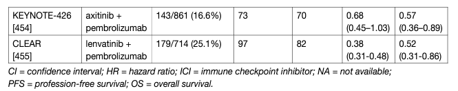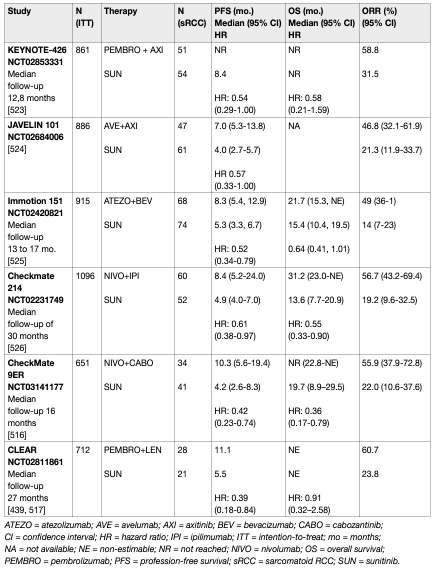 Table 4: Subgroup analysis of first-line immune checkpoint inhibitor combinations in RCC patients with sarcomatoid histology Cross trial comparison is not recommended and should occur with caution