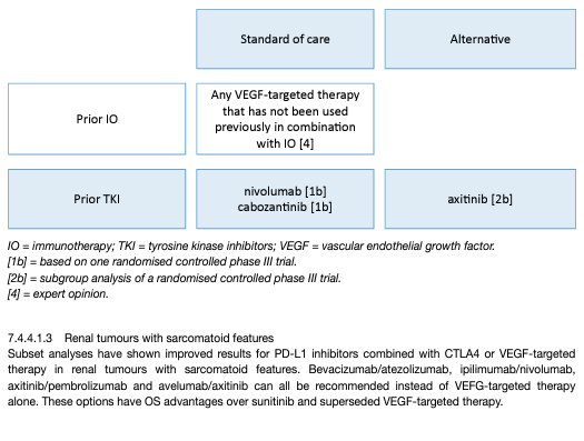 Patients who stop nivolumab plus ipilimumab because of toxicity require expert guidance and support from a multi-disciplinary team before re-challenge can occur. Patients who do not receive the full four doses of ipilimumab due to toxicity should continue on single-agent nivolumab, where safe and feasible. Treatment past progression with nivolumab plus ipilimumab can be justified but requires close scrutiny and the support of an expert multi-disciplinary team [80,81]. Patients who stop TKI and IO due to immune-related toxicity can receive single-agent TKI once the adverse event has resolved. Adverse event management, including transaminitis and diarrhoea, require particular attention as both agents may be causative. Expert advice should be sought on re-challenge of ICIs after significant toxicity. Treatment past progression on axitinib plus pembrolizumab or nivolumab plus cabozantinib requires careful consideration as it is biologically distinct from treatment past progression on ipilimumab and nivolumab. Generally, the Panel of EAU Guidelines edition 2022 is of the opinion that nivolumab plus ipilimumab, pembrolizumab plus axitinib and nivolumab plus cabozantinib should be administered in centres with experience of immune combination therapy and appropriate supportive care within the context of a multi-disciplinary team.