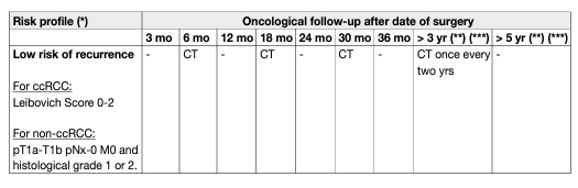 The RECUR consortium, initiated by this Panel of EAU Guidelines edition 2022, collects similar data with the aim to provide comparators for guideline recommendations. Recently published RECUR data support a risk-based approach; more specifically a competing-risk analysis showed that for low-risk patients, the risk of non-RCC related death exceeded the risk of RCC recurrence shortly after the initial surgery. For intermediate-risk patients, the corresponding time point was reached around four to five years after surgery. In high-risk patients, the risk of RCC recurrence continuously exceeded the risk of non-RCC related death [137]. In the near future, genetic profiling may refine the existing prognostic scores and external validation in datasets from adjuvant trials have been promising in improving stratification of patient’s risk of recurrence [137, 138]. Recurrence after PN is rare, but early diagnosis is relevant, as the most effective treatment is surgery [121, 139]. Recurrence in the contralateral kidney is rare (1–2%) and can occur late (median 5–6 years) [140]. Follow-up can identify local recurrences or metastases at an early stage. In metastatic disease, extended tumour growth can limit the opportunity for surgical resection, which is considered the standard therapy in cases of resectable and preferably solitary lesions. In addition, early diagnosis of tumour recurrence may enhance the efficacy of systemic treatment if the tumour burden is low.